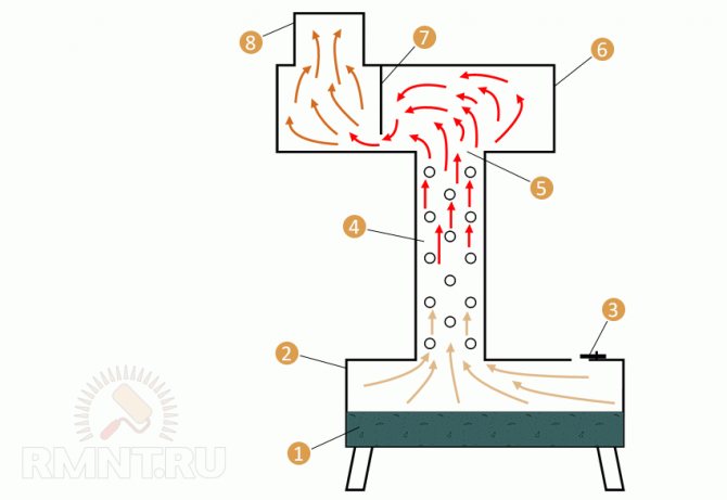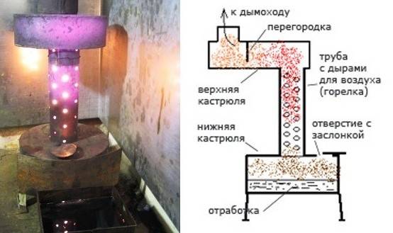 Dans la partie inférieure du four, le chauffage et l'évaporation de l'extraction sont effectués. Les vapeurs combustibles montent et, traversant le tuyau, interagissent avec l'oxygène dissous dans l'air.