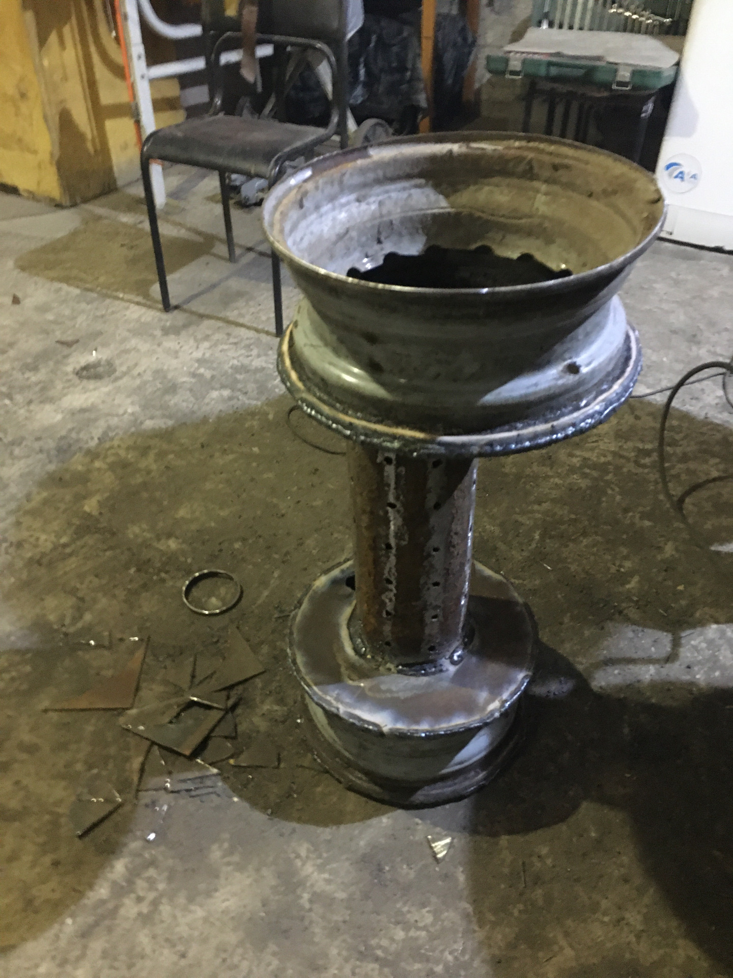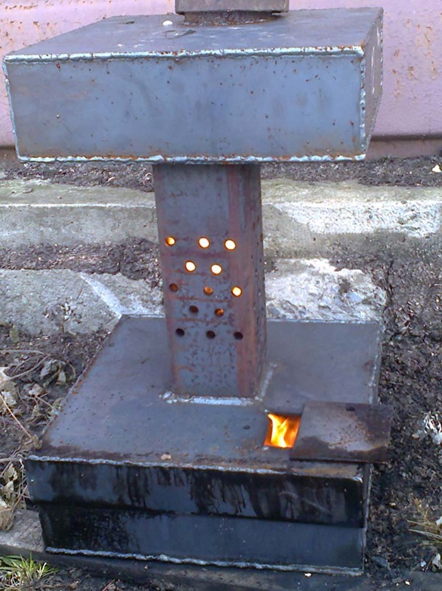 • Tout d'abord, vous devriez faire un ventilateur. Un trou de 5 cm de haut et 20 cm de large est découpé au fond d'un long morceau de tuyau.Une épaisse plaque d'acier arrondie est soudée au-dessus du trou.
