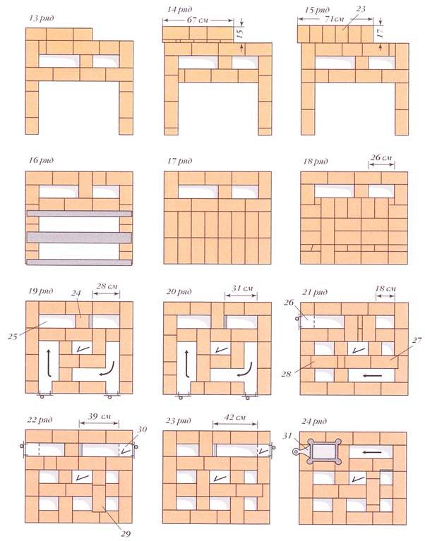 Neuvième étape. Menez la ponte jusqu'au 20e rang. Arrivé à cette ligne, bloquez compartiment de cuisson et le premier bouchon. Assurez-vous de laisser dans la maçonnerie pleine le nombre requis d'ouvertures pour la course d'été et le canal de levage, ainsi que les évents du compartiment de cuisson. Placez des briques sur les coins en acier - de cette façon, vous assurerez une plus grande résistance et fiabilité du poêle.