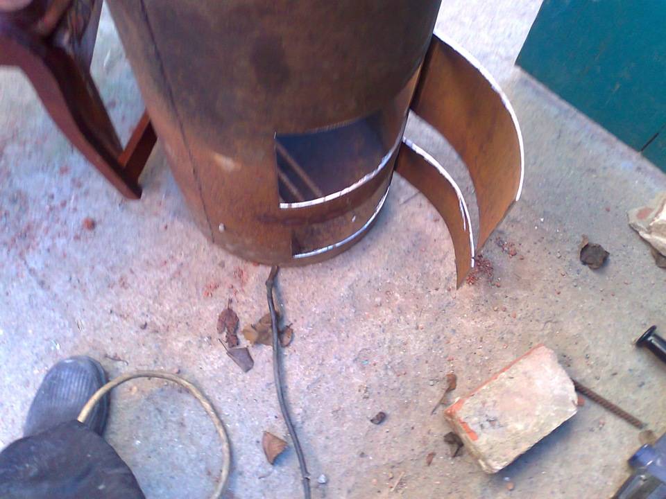 Nous coupons le haut du canon avec une meuleuse et découpons une ouverture latérale sous la porte du four.