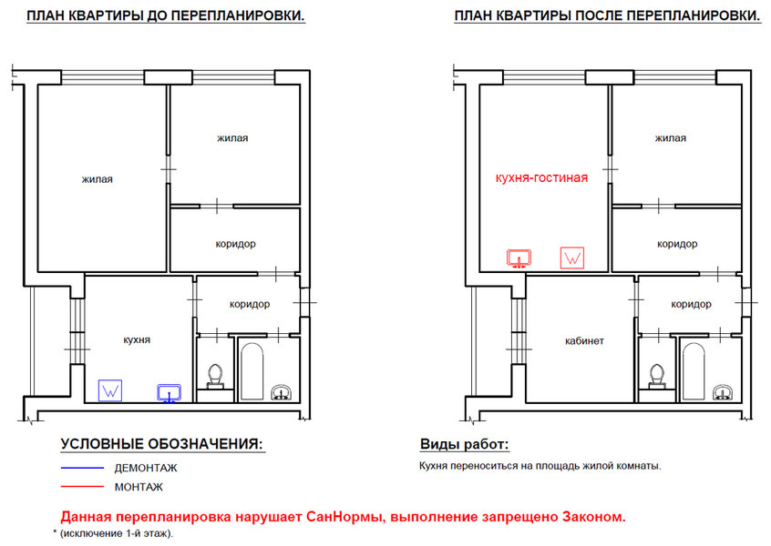 En étudiant l'ensemble de la réglementation, il semble qu'il soit tout simplement impossible d'obtenir un permis de travail. Cependant, ce n'est pas le cas. Bien qu'il existe de nombreuses interdictions, il est tout à fait possible de procéder au transfert de la cuisine. Dans quels cas la loi sera-t-elle du côté du propriétaire de l'appartement ?