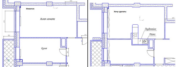 Il y a deux façons. La cuisine-salon combinée est organisée sans changer l'emplacement des équipements technologiques et sanitaires. Zone économique avec tous ceux-là. nodes est déplacé dans un local non résidentiel selon le projet.