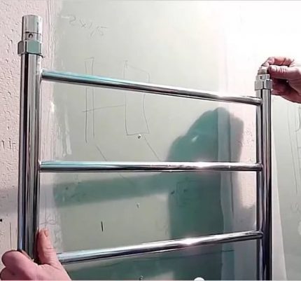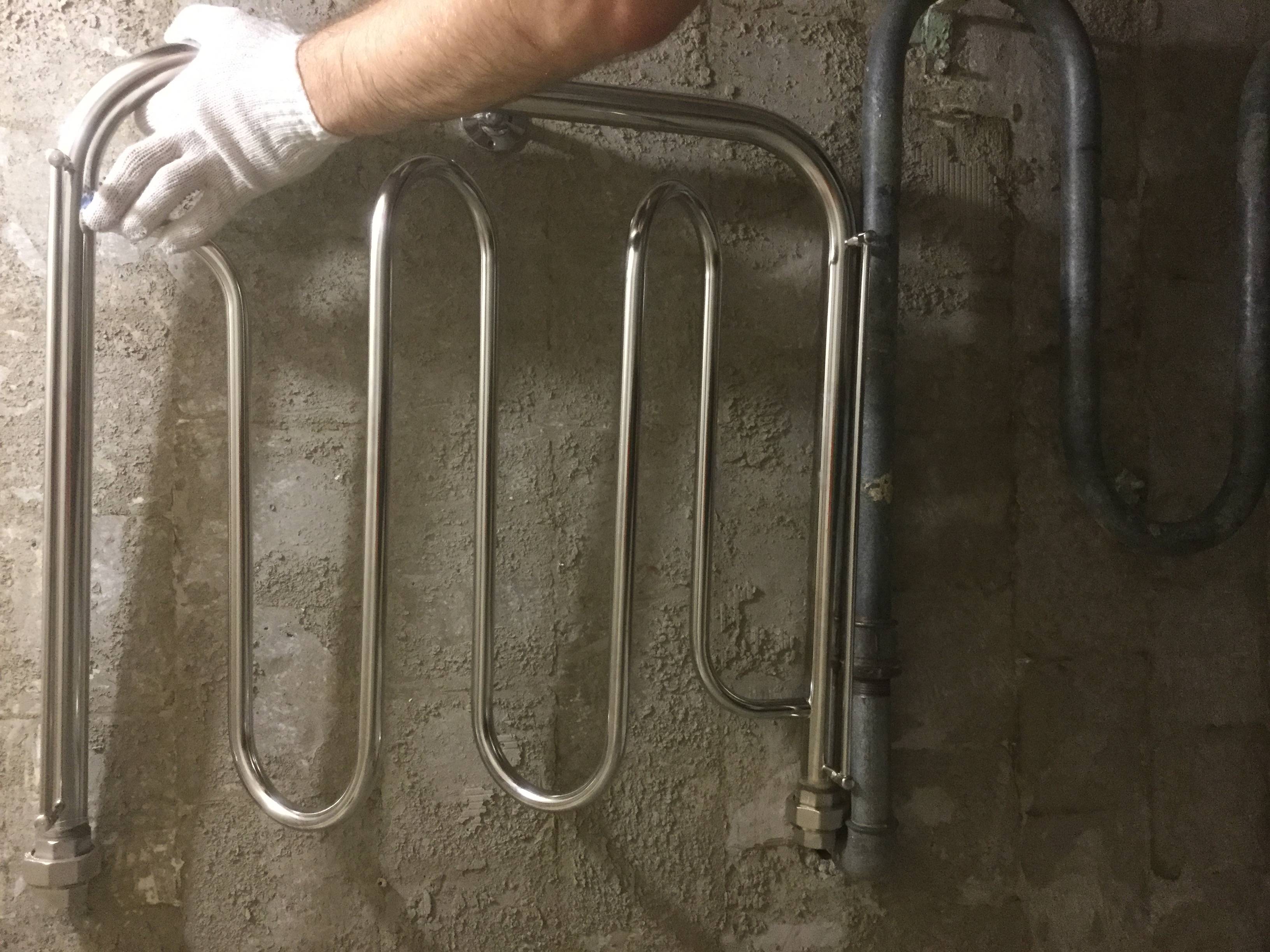 Après avoir choisi un endroit de l'autre côté du mur où le transfert du nouveau sèche-serviettes est prévu, il y est fixé avec des robinets pré-emballés.L'installation du sèche-serviettes doit être effectuée sur des supports suspendus afin d'éviter les déformations de température entre le mur et le tuyau.