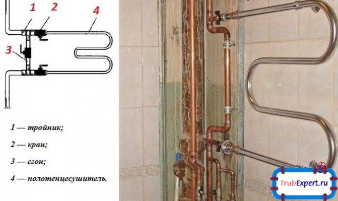 Les sections du tuyau ECS dans lesquelles le sèche-serviettes sera connecté doivent être connectées les unes aux autres avec un cavalier. La nécessité de cet élément de complication est évidente :