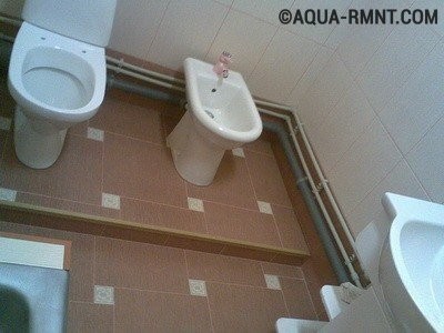 Très souvent, le propriétaire de la salle de bain comprend que pour assurer une pente suffisante du tuyau d'égout, les toilettes devront être surélevées et la hauteur de levage peut être assez importante. Tout dépend du diamètre du tuyau et de la distance à laquelle l'appareil doit être retiré. Il peut y avoir deux options pour résoudre le problème: soit surélever le sol de la salle de bain et y masquer le pipeline, soit installer une sorte de podium sous les toilettes. Les deux options sont tout à fait viables, mais en pratique, la seconde est la plus souvent utilisée. Comme la solution la moins chronophage et la plus pratique.
