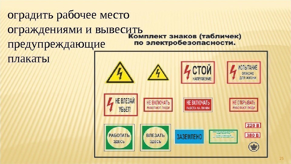 Lorsqu'il est dangereux de s'approcher de parties sous tension à proximité, de telles signalisations sont affichées (sous forme d'affiches et de plaques fixes, ou dessinées sur le corps de l'installation électrique) :
