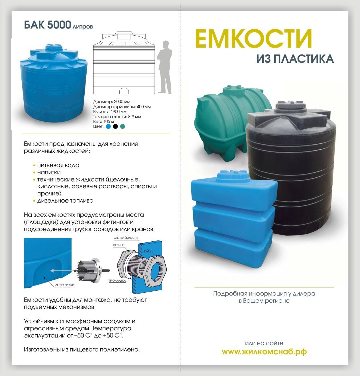 Les réservoirs carrés sont fabriqués avec un couvercle hermétiquement vissé et un raccord qui vous permet de combiner plusieurs conteneurs en un seul système ou de fixer des équipements supplémentaires. De petits conteneurs carrés sont également produits, qui passent par la porte et peuvent être installés dans les garages et sur les balcons.