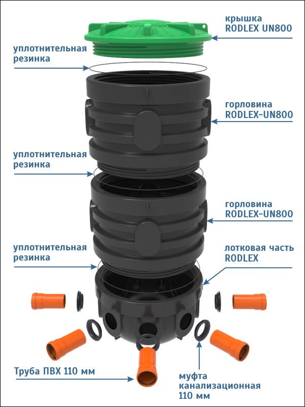 Le trou d'homme a des dimensions de col standard, sa taille est de 70 cm.Si le diamètre du tuyau est de 60 cm, le col est construit de manière à ce que les dispositifs de nettoyage, en particulier les boules et les cylindres, puissent y pénétrer.
