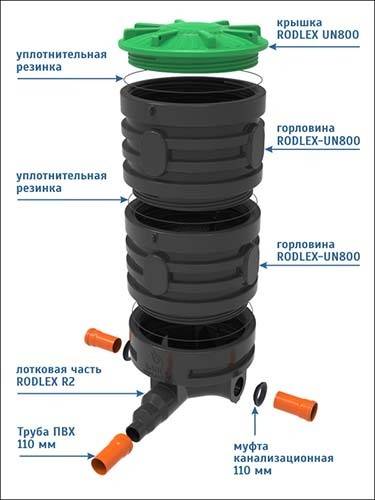 Directement dans la partie plateau se trouve un pipeline qui fait passer les eaux usées. Si le trou d'homme est de type linéaire, le bac sera également droit et la partie inférieure sera verticale. La hauteur du bac doit être égale ou supérieure aux dimensions du tuyau le plus large.