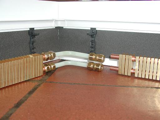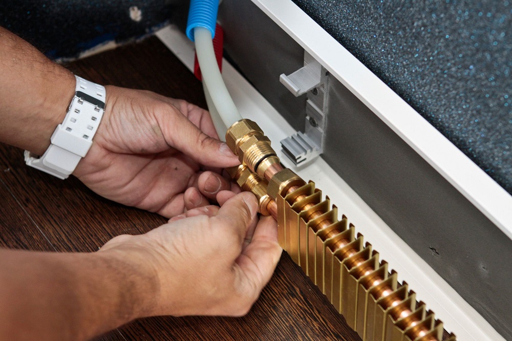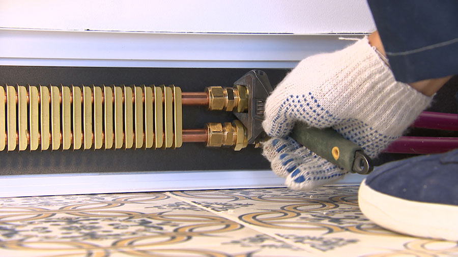 Connectez les éléments chauffants des plinthes chauffantes avec des tuyaux, des tuyaux en cuivre