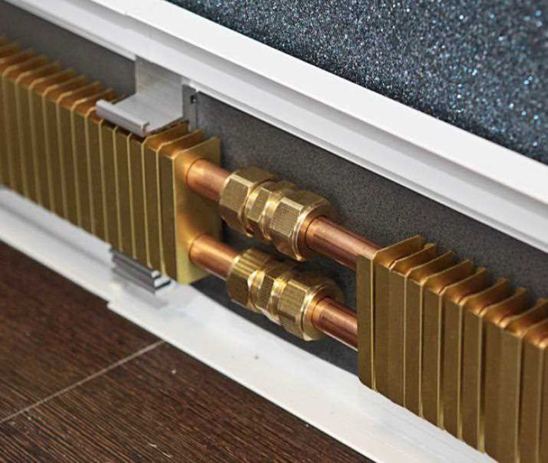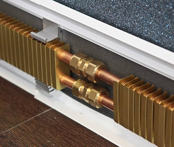 Structurellement, le système de chauffage des plinthes se compose d'un module chauffant recouvert d'une bande décorative en aluminium. Le module chauffant est constitué de deux tubes en cuivre sur lesquels sont posées des plaques en aluminium. Le cuivre est connu pour avoir une dissipation thermique élevée et une résistance élevée à la corrosion, mais son prix est élevé. L'aluminium transfère également bien la chaleur et est beaucoup moins cher. Cette combinaison de cuivre + aluminium est utilisée dans de nombreux appareils de chauffage et a prouvé son efficacité.