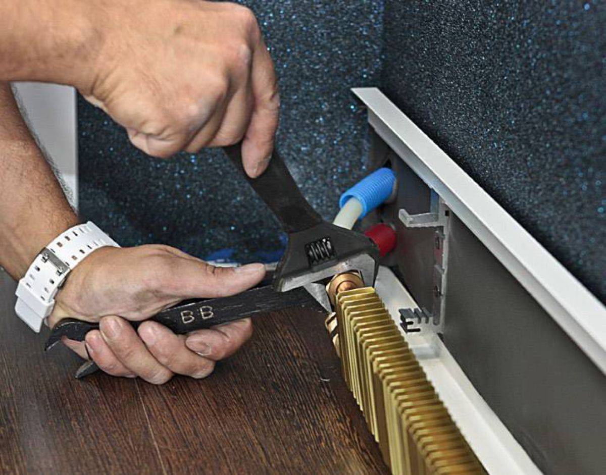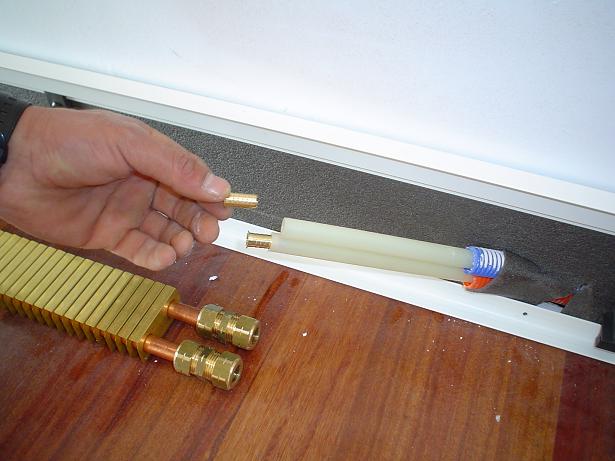 Chauffage par plinthes: caractéristiques de l'installation d'une plinthe chauffante à eau et électriqueLors de la connexion du module de chauffage, il est nécessaire de retirer 2-3 lamelles du bord et de mettre des écrous de connexion, des pièces de sertissage, des joints en caoutchouc sur les tubes