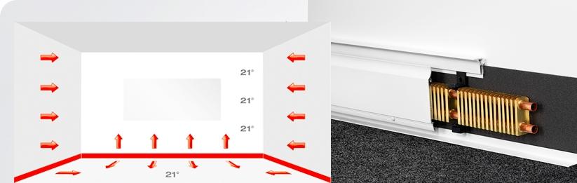 Le principe de fonctionnement des radiateurs plinthes repose non pas sur la convection d'air, mais sur l'effet Coanda. Sa signification réside dans le fait qu'une zone de basse pression apparaît près des surfaces, ce qui est dû au libre accès de l'air d'un seul côté et à l'imperméabilité. Un courant d'air se répand sur une grande surface, qui ne se développe qu'en surface.