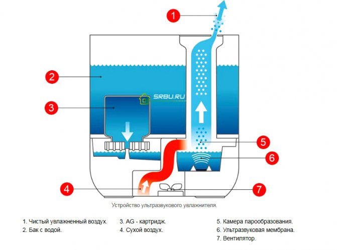 Le fonctionnement d'un appareil à ultrasons est basé sur la division de l'eau provenant d'un réservoir de stockage spécial en petites particules.En même temps, le ventilateur intégré le prend dans la pièce et l'alimente pour le mélanger à l'intérieur du désodorisant. Il y a saturation en humidité. La composition humide est ensuite renvoyée dans la pièce.