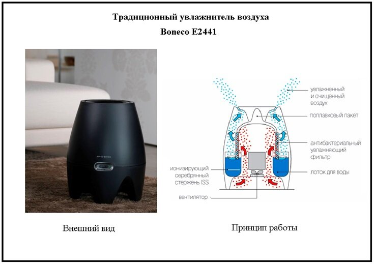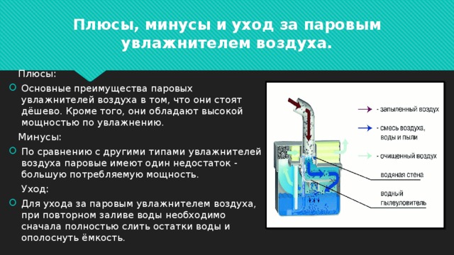 De tels dispositifs de type classique présentaient de nombreux avantages: faible niveau de bruit, sécurité, faible coût, faible consommation d'énergie. La simplicité de l'appareil a créé un certain nombre d'inconvénients : le manque de fonctionnalité pour le nettoyage et le filtrage, l'impossibilité de réglage et la contamination rapide des filtres d'humidification.