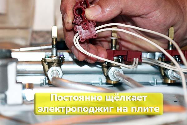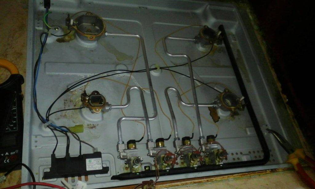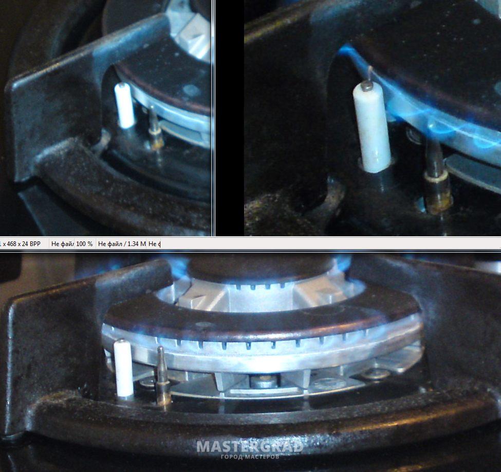 La photo montre un moyen simple de se débarrasser du défaut d'étincelle spontanée du système d'allumage, obtenu en raison de la pénétration d'humidité. Réchauffer l'appareil pendant un certain temps avec tous les brûleurs aide à se débarrasser des clics incontrôlés.