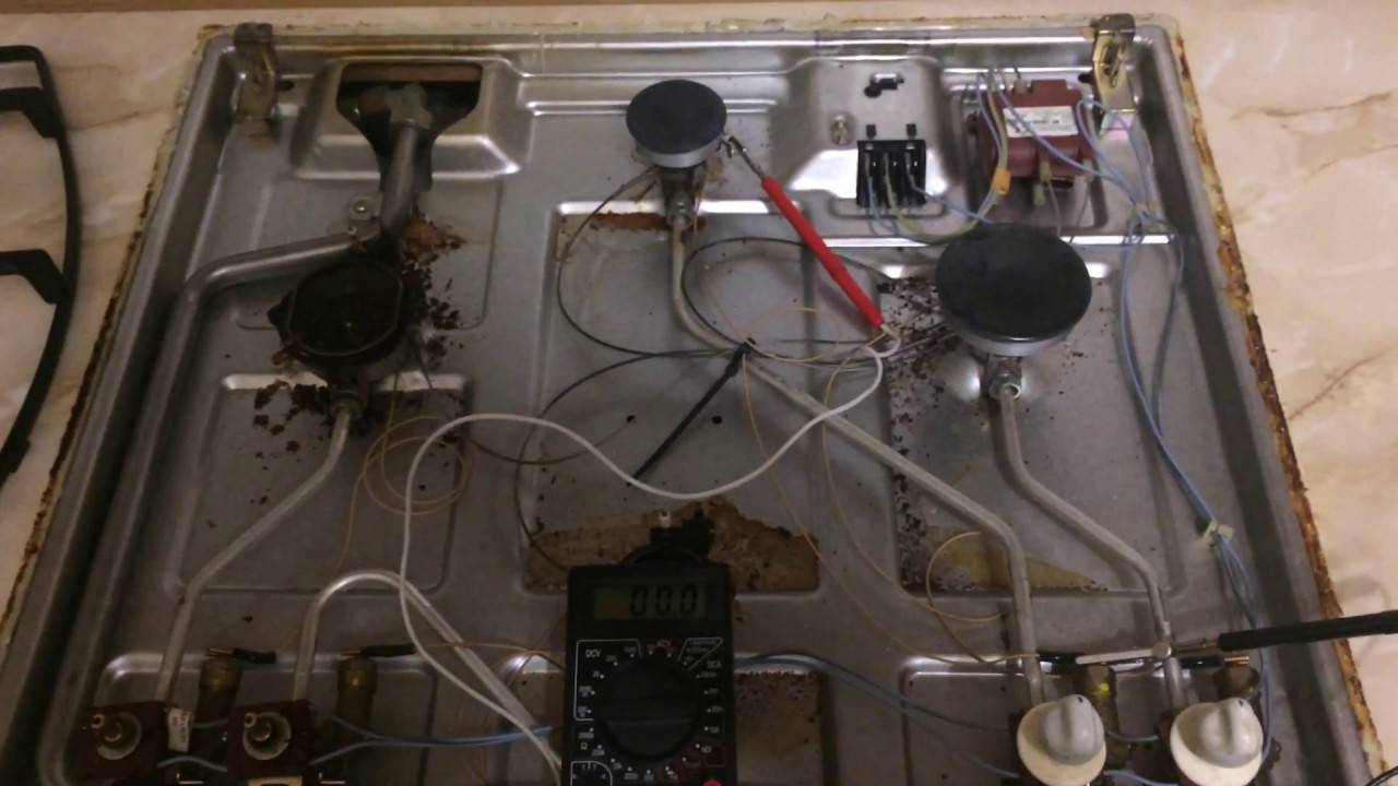 Vérifiez les fils d'alimentation qui vont à cette bougie. Pour ce faire, retirez les brûleurs, le panneau supérieur.S'il est en vitrocéramique, il peut être planté sur un scellant, on le coupe et on enlève le panneau avant. S'il est en métal, dévisser les boulons de fixation. Sous la face avant, on s'intéresse aux fils électriques. Il est nécessaire de vérifier la rupture de l'isolation à la terre (masse). Pour ce faire, vous pouvez appuyer plusieurs fois sur le bouton d'allumage, en cas de panne, une étincelle jaillira à cet endroit. S'il n'y a pas de dommage visible, nous appelons les fils avec un multimètre pour l'intégrité et pour une panne avec le sol. Nous remplaçons les conducteurs défectueux trouvés par des sections similaires.