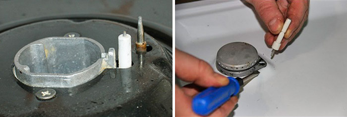 Une autre raison de la panne réside dans la panne de la bougie du brûleur. Si vous souhaitez vérifier les performances, coupez le gaz et appuyez sur le contact. S'il n'y a pas d'étincelle, la bougie est défectueuse. La cause de l'échec peut être la contamination de la bougie par de la graisse, l'oxydation de la tige d'acier et les fuites. Des interruptions de travail apparaîtront si une fissure apparaît sur l'élément et qu'une étincelle frappe sur le côté dans la zone de violation.Il est impossible d'isoler ou de réparer les bougies, la seule solution correcte est le remplacement.