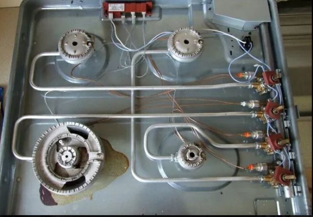 Afin de déterminer la fuite dans ce cas, il est nécessaire de retirer les brûleurs, retirer le couvercle, réinstaller les brûleurs à leur place (sans le couvercle), appliquer de l'eau savonneuse sur les joints et allumer soigneusement les brûleurs à tour de rôle. Attention : des bulles apparaîtront au point de fuite, indiquant une dépressurisation. La raison d'un tel dysfonctionnement peut être la destruction des rondelles d'étanchéité sur les buses, un serrage trop lâche des raccords, un défaut de la bague d'étanchéité aux points de fixation des tubes
