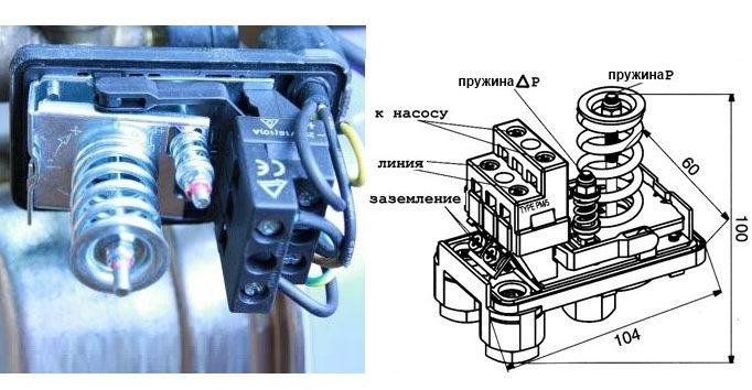 Le schéma ci-dessus montre un pressostat standard pour les pompes Marina. Sur celui-ci, sous le couvercle en plastique du boîtier, il y a deux ressorts. La plupart d'entre eux tournent dans le sens des aiguilles d'une montre, il est responsable de la pression minimale dans le réservoir à laquelle la station s'allume. En faisant tourner un petit ressort, nous ajustons la pression maximale, une fois atteinte, la pompe s'éteint.