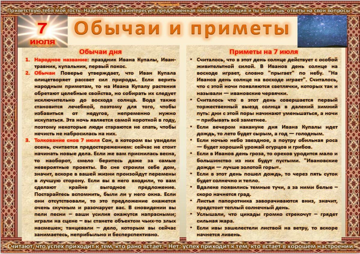 - La chance sourit à ceux qui se lèvent tôt. Levez-vous avec les premiers rayons du soleil - la journée se déroulera avec succès (celui qui se lève tôt, Dieu le lui donne).