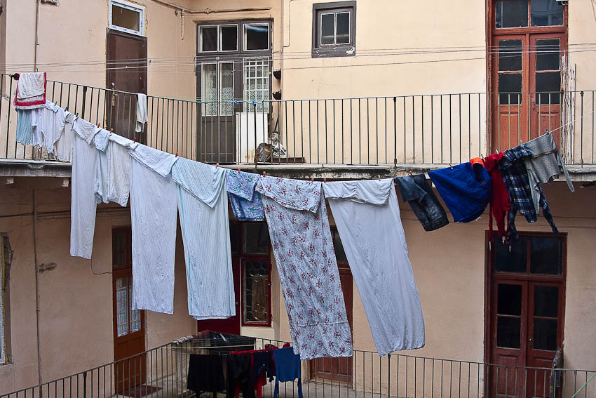 • La méthode est bonne car le linge ne prend pas de place sur la zone utile du balcon, cependant, il n'est pas très pratique d'atteindre les cordes éloignées lors de la suspension. De plus, le vent peut «ébouriffer» le linge contre les murs de la maison, et la poussière et les fumées des voitures qui passent se déposent sur les choses fraîchement lavées;