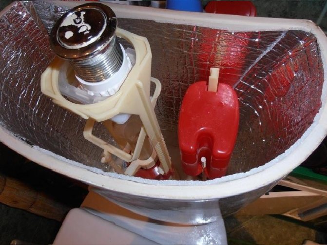 L'achat d'un réservoir / cuvette coûteux n'est pas toujours conseillé. Vous pouvez résoudre le problème vous-même. Pour cela, de la mousse de polyéthylène est placée à l'intérieur du réservoir. Grâce à une telle isolation thermique, il est possible de réduire plusieurs fois la différence de température et d'éliminer les gouttes.