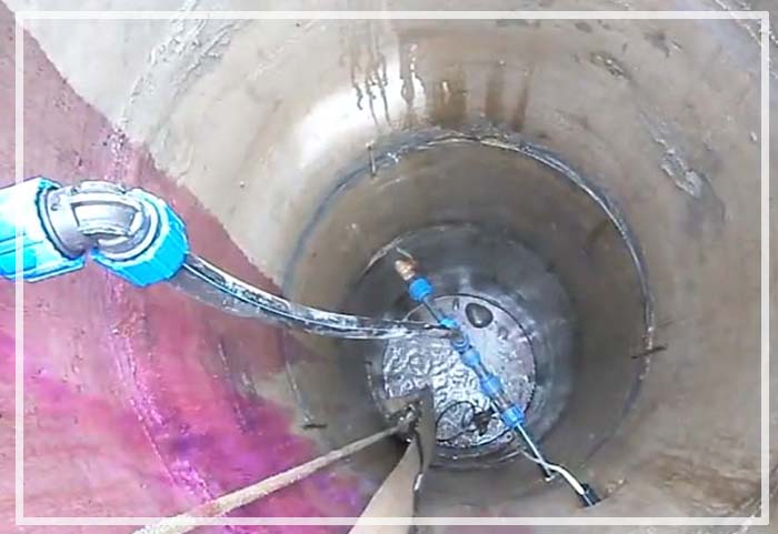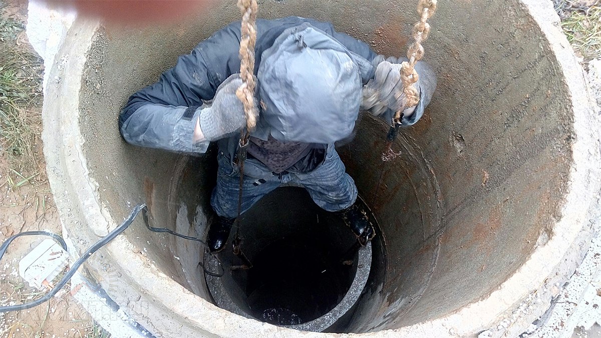 Une personne en tenue spéciale doit descendre dans un puits vide avec un câble.À l'aide d'une brosse à poils durs ou d'un grattoir spécial, il nettoiera la surface intérieure de l'accumulation de masses de limon et de saleté.