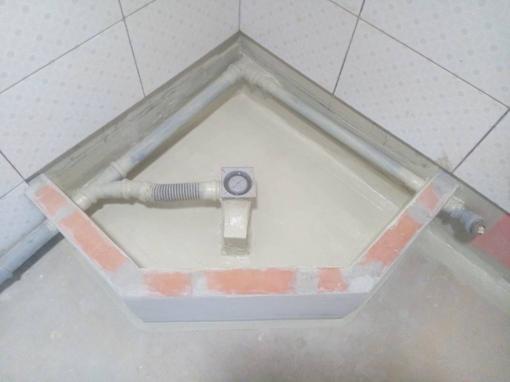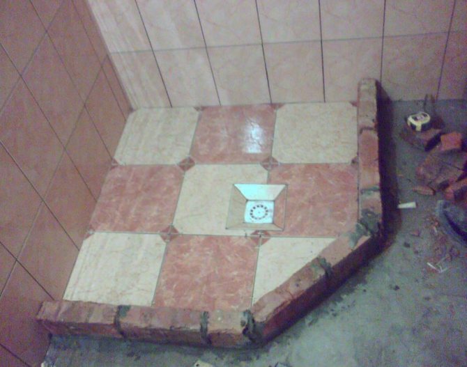 - Procédez à la formation du sol du receveur de douche à partir de carreaux. Pour ce faire, les briques sont posées à plat sur le sol à l'aide de mortier de ciment en une seule couche. Dans le même temps, toutes les fissures et les vides sont remplis de ciment. Après séchage, procéder au dispositif d'imperméabilisation.