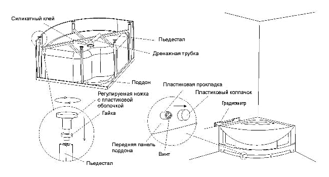 Il sera un peu plus difficile de déterminer le paramètre de plomberie souhaité. Cela est dû au fait que la palette est installée sur le siphon (le nœud reliant le trou de vidange de la douche et le tuyau d'égout). Sa hauteur varie de 10 à 20 cm, seul le fait d'avoir tous les composants sous la main permet de calculer correctement la hauteur du bas de la structure de plomberie. Certains modèles sont équipés de pieds réglables qui permettent de régler le niveau de hauteur du sol vers le bas.