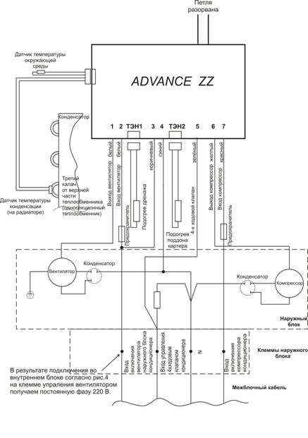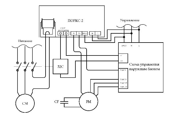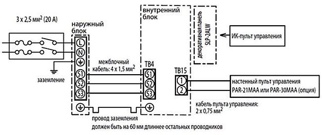 La ligne d'alimentation auxiliaire relie les blocs externes et internes du système divisé. Dans ce cas, ce dernier agit comme chef de file, exerçant un contrôle centralisé. Le câble d'alimentation de l'unité extérieure doit être sélectionné selon les recommandations d'alimentation du fabricant. Il s'agit généralement d'un fil torsadé en cuivre d'une section d'au moins 2,5 mm².