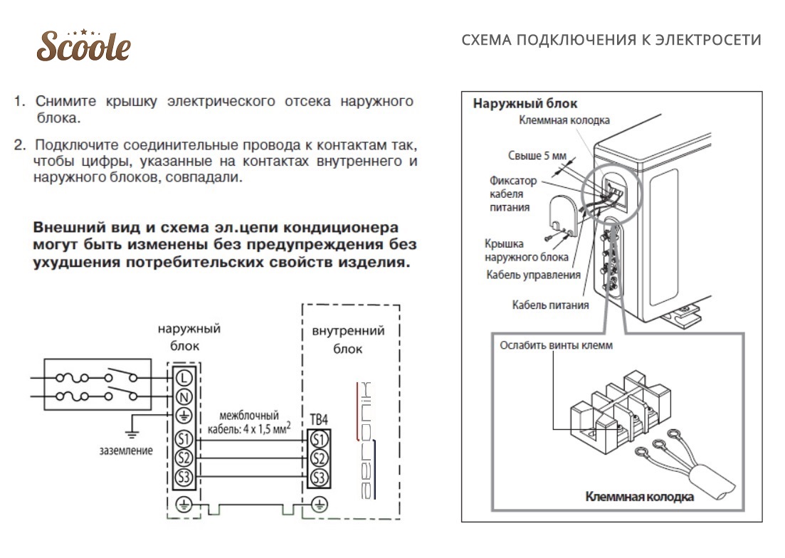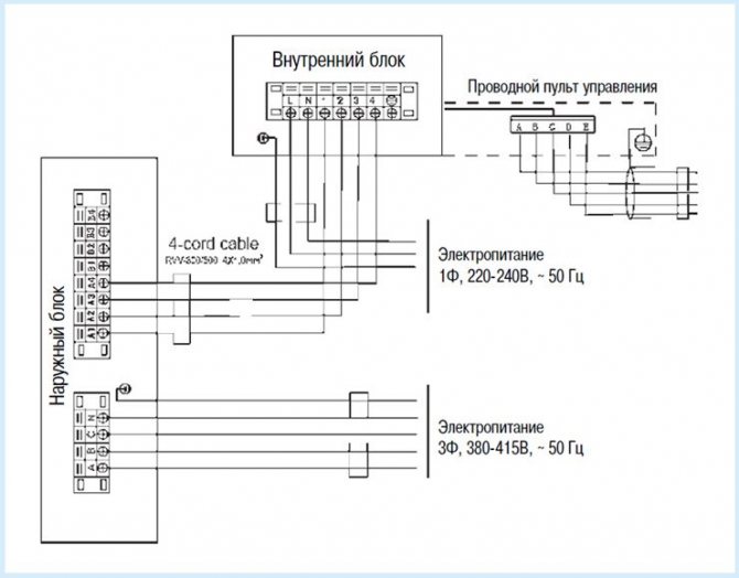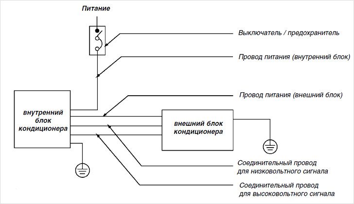 Pour les climatiseurs domestiques, le schéma de raccordement électrique diffère des unités industrielles plus puissantes. Ces derniers sont généralement connectés à un réseau triphasé et à la maison - uniquement à un monophasé. Il existe deux méthodes principales de connexion électrique du climatiseur :