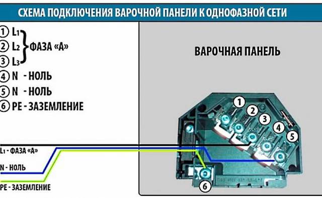 Les instructions d'installation montrent comment connecter la table de cuisson vous-même. Les schémas sont affichés sur le boîtier de l'instrument à l'arrière. Parmi plusieurs options pour les cas d'un nombre différent de phases et de conclusions, vous devez choisir celle qui convient.