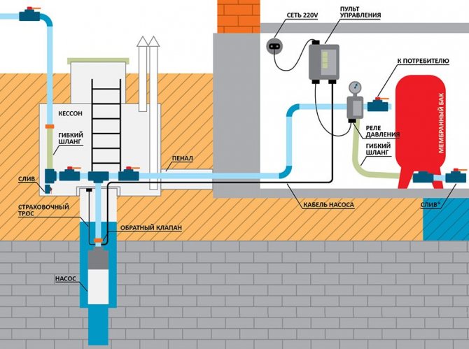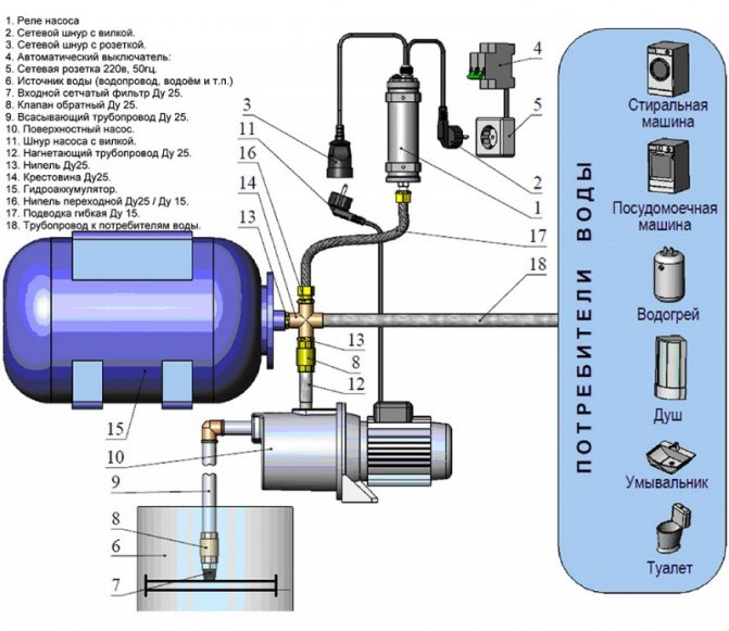Le plus souvent, un système d'alimentation en eau autonome d'une maison privée implique la présence d'un accumulateur hydraulique et d'une pompe de surface. Dans ce cas, le fabricant propose un équipement de pompage intégré préfabriqué, qui comprend déjà un réservoir hydraulique. Cependant, la possibilité de placer le réservoir à membrane avec la pompe dans un caisson ou dans une buanderie chauffée n'est pas exclue.