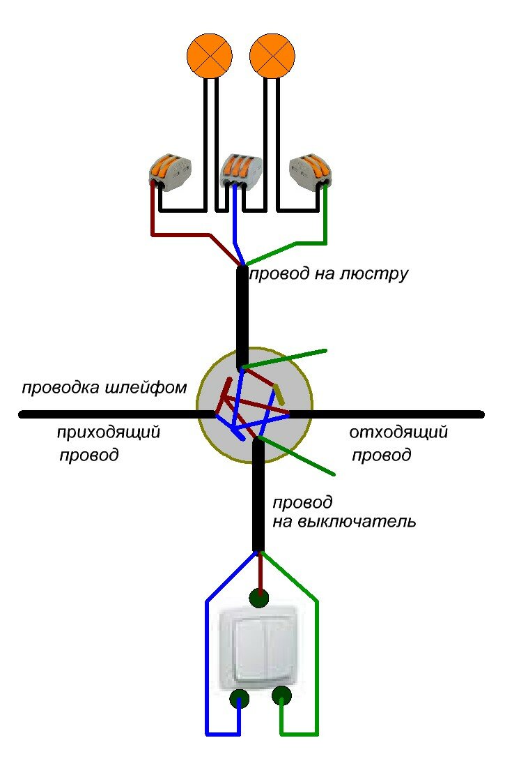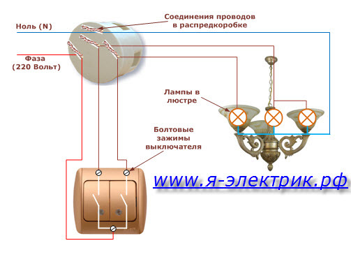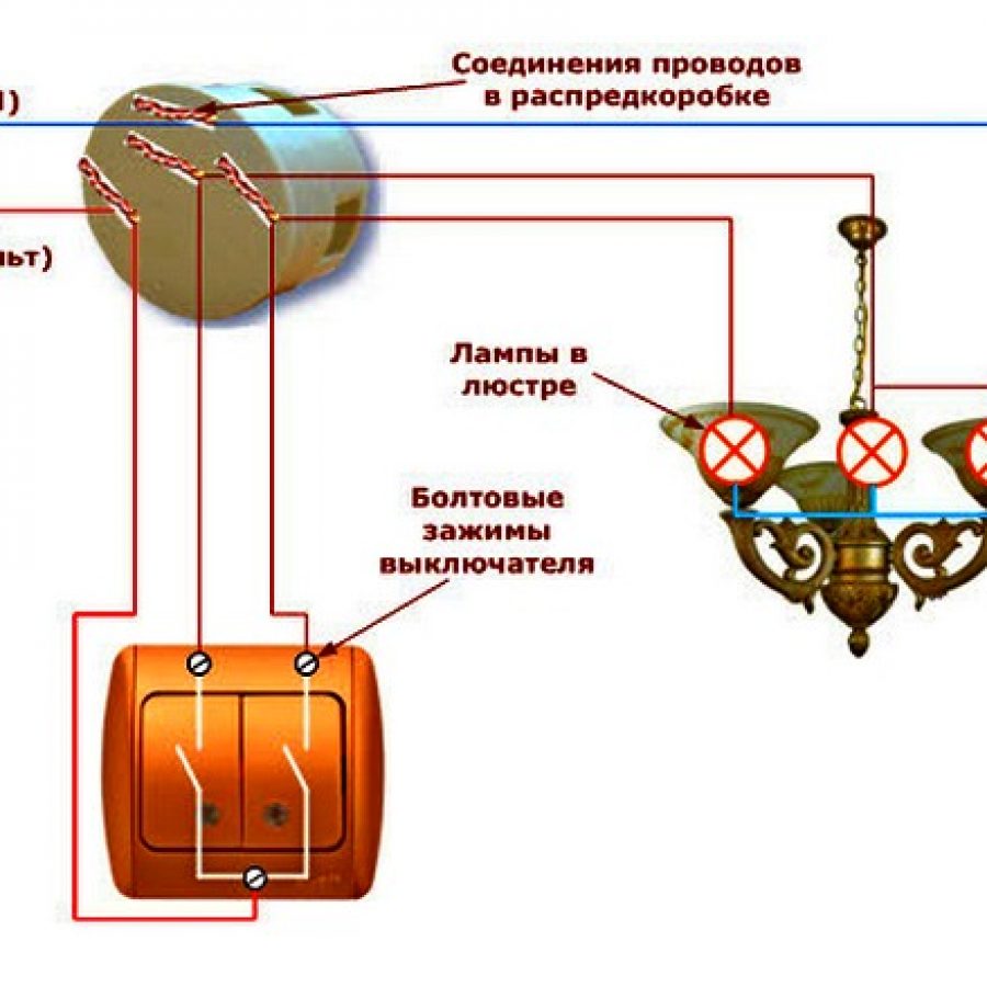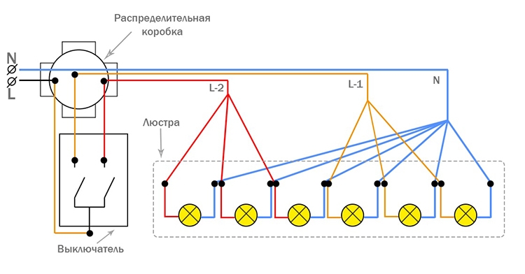 La méthode de connexion est assez simple, même s'il y a plus d'une ou deux ampoules dans le lustre. Il est beaucoup plus facile de le faire si des fils de deux couleurs sortent du lustre. Dans ce cas, les fils de la même couleur sont torsadés ensemble, formant ainsi une ligne à 2 fils. La figure ci-dessous montre un schéma d'allumage d'un lustre à un seul interrupteur.