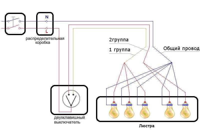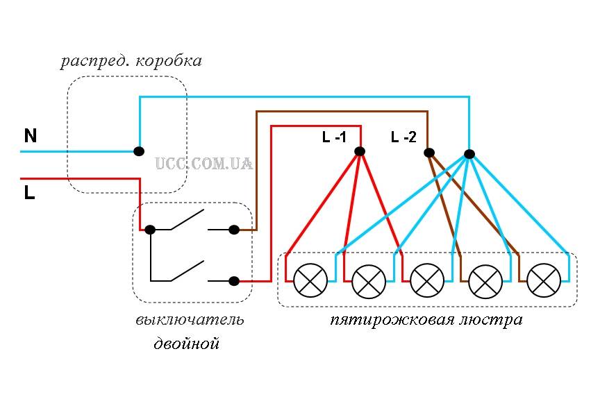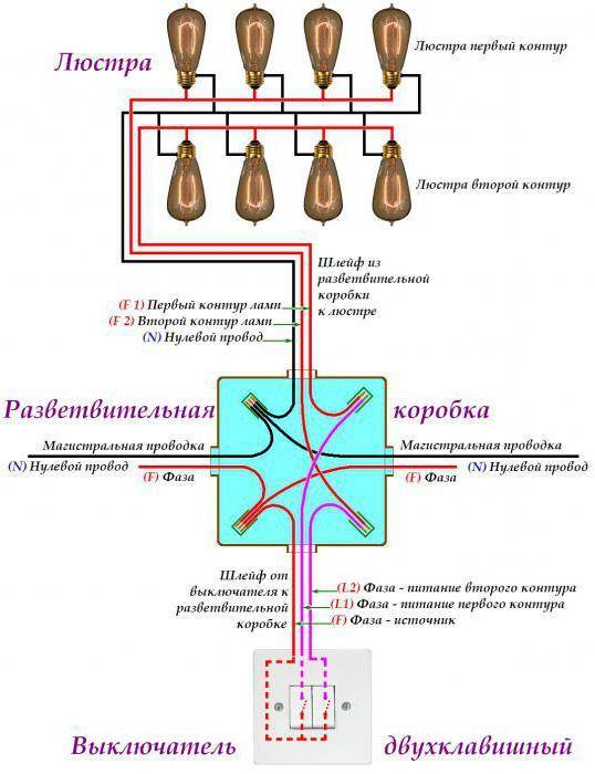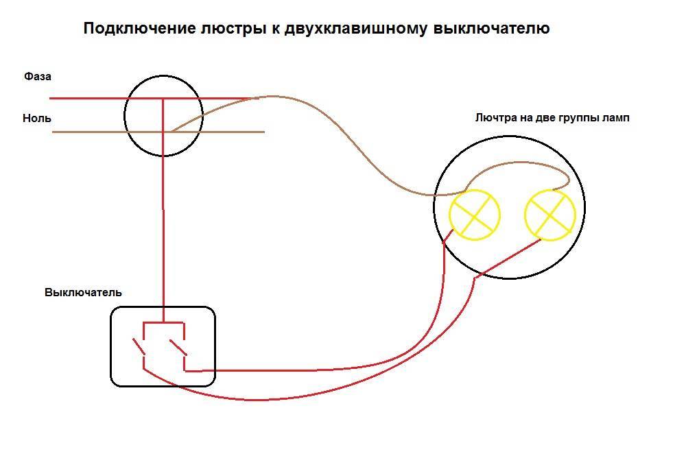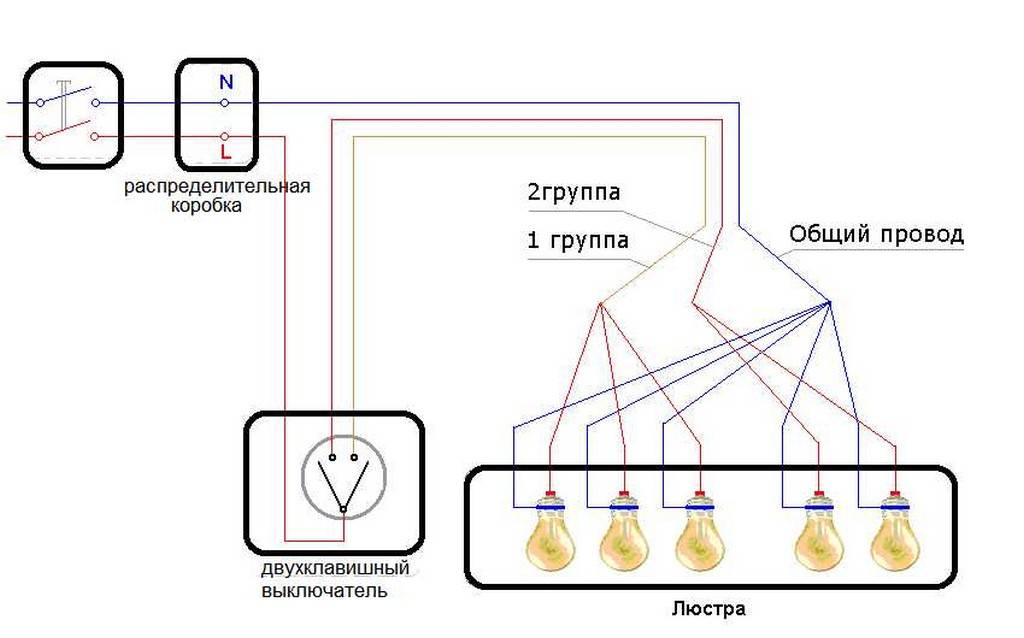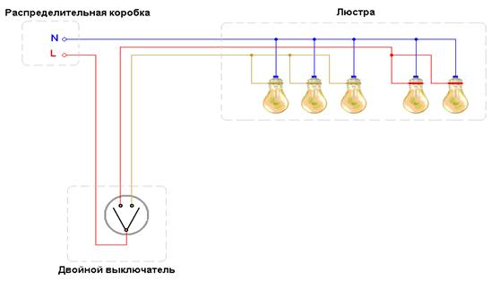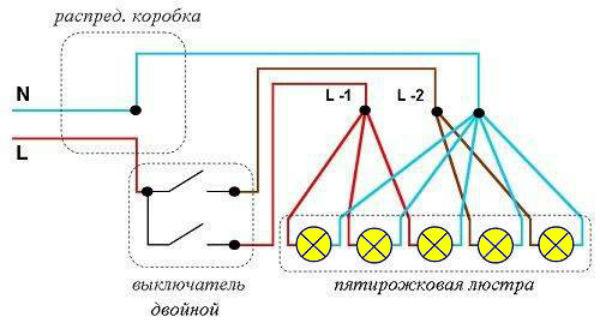 Un interrupteur à deux clés approprié et sa connexion correcte simplifieront le contrôle de la lumière dans la pièce. Certes, vous devez toujours créer des groupes optimaux d'ampoules qui composent le lustre.