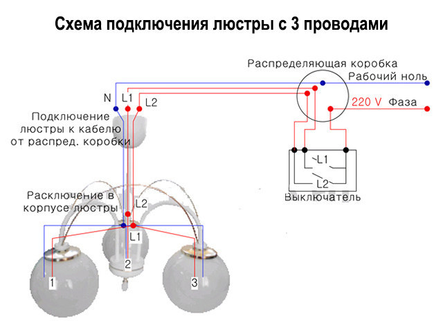 - Deux conducteurs - zéro et phase. Cela signifie qu'il sera possible d'allumer ou d'éteindre uniquement toutes les lampes du lustre en même temps.