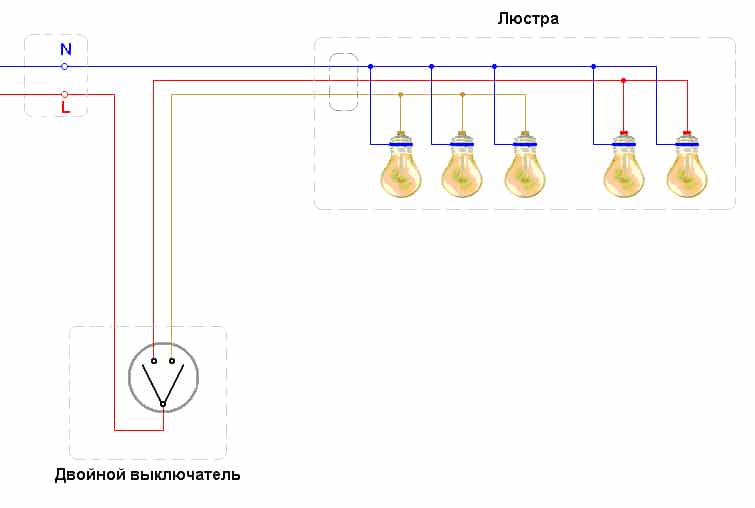 Connexion d'un lustre à cinq bras à un interrupteur double (deux gangs)