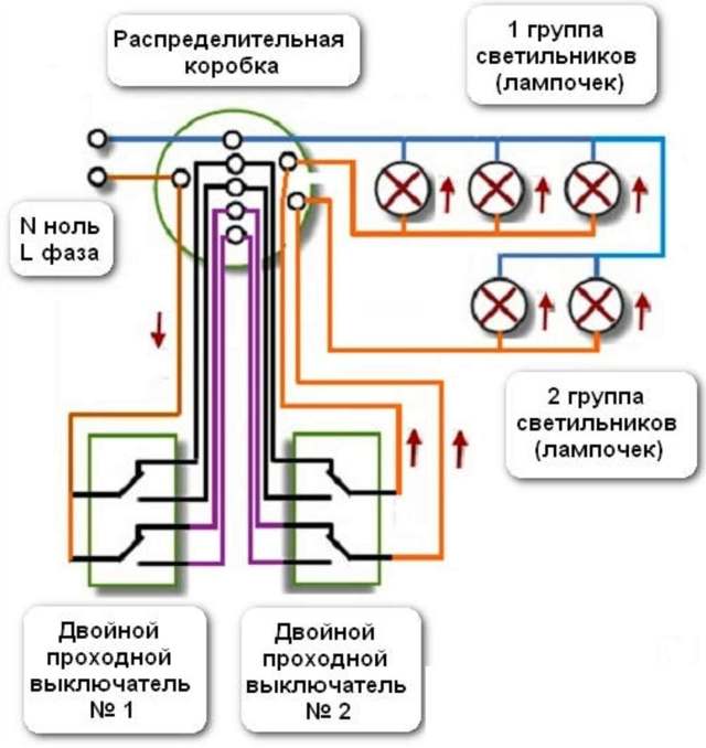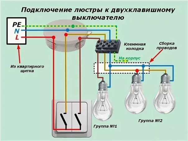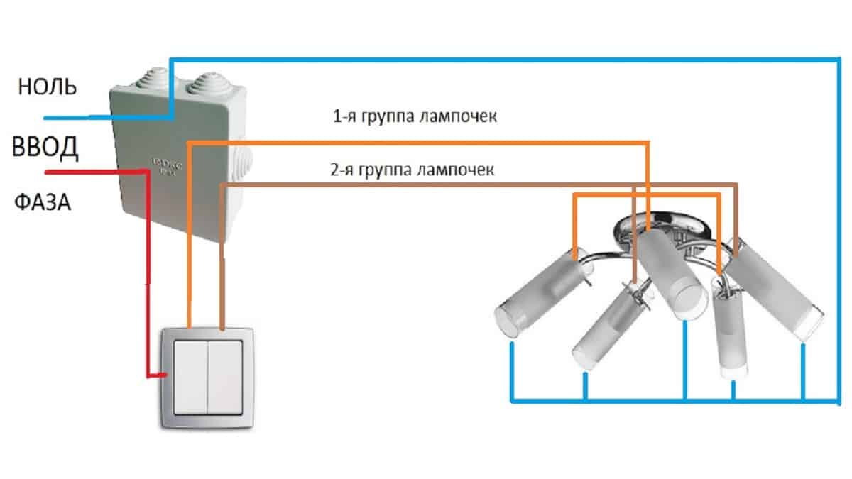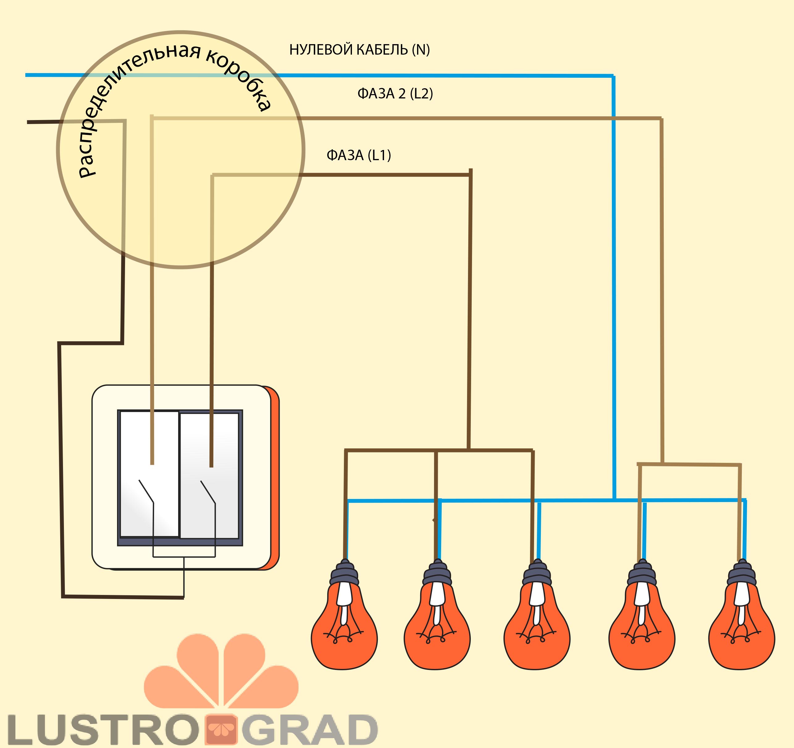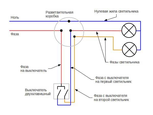 Pour se connecter à un interrupteur à deux gangs, les lampes sont connectées en groupes. Six cœurs zéro doivent être combinés dans un seul terminal. La phase fournie par le boîtier est reliée au contact commun du dispositif de déconnexion.