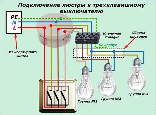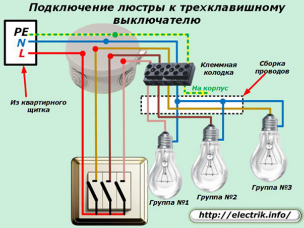 Les deux autres fils sont connectés au conducteur de phase et neutre. En règle générale, les lustres modernes sont nécessairement produits avec un fil de terre, qui est associé aux exigences des règles de sécurité.
