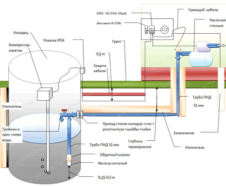 Le tuyau du puits ou du puits à la maison est posé sous le niveau de congélation du sol et isolé pour des raisons de sécurité - à cette fin, un câble électrique à deux conducteurs autorégulateur est généralement utilisé, qui chauffe jusqu'à 65 degrés. A ceux qui ont bien sous la maison, ce sera plus facile, puisque la station de pompage est située au sous-sol, et non à l'air libre.