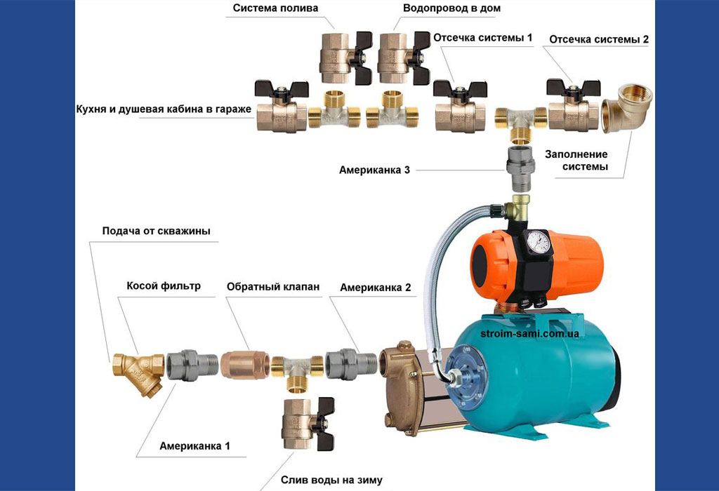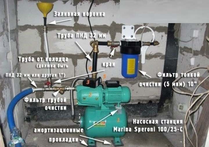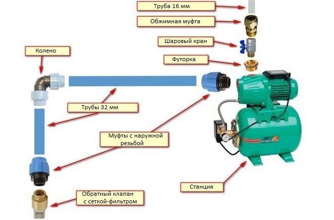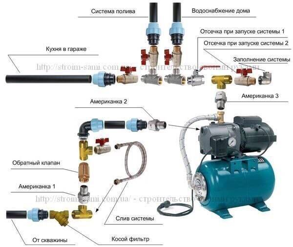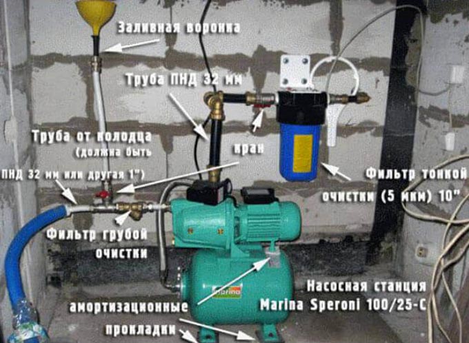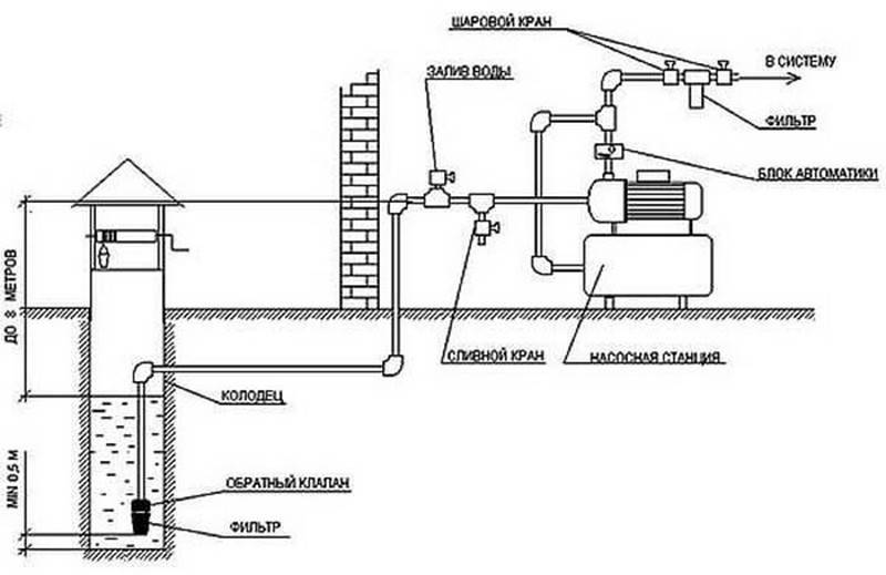 Le choix de l'équipement et du lieu d'installation représente la moitié de la bataille. Vous devez également tout connecter correctement dans un système - une source d'eau, une station et des consommateurs. Le schéma de raccordement exact de la station de pompage dépend de l'emplacement choisi. Mais de toute façon il y a :