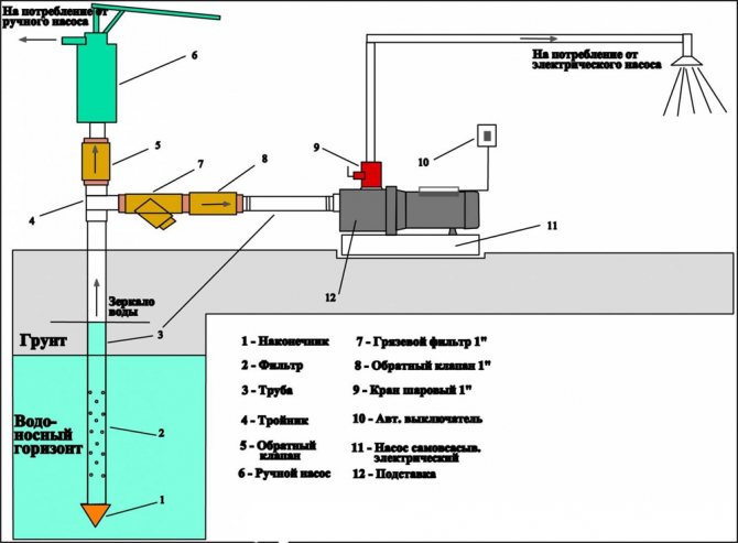 - Pompe de surface. Convient uniquement si le niveau d'eau dynamique dans le puits ne descend pas en dessous de 7 mètres du sol.