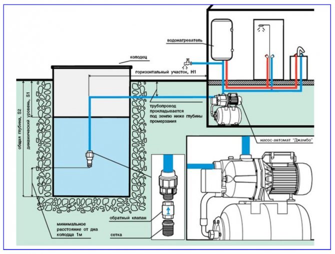 Si les propriétaires envisagent de vivre dans une maison de campagne uniquement pendant la saison chaude, l'installation du système ne devrait poser aucun problème. La pompe est connectée au réseau électrique, le tuyau est descendu dans le puits et le tuyau sous pression est connecté au réseau d'alimentation en eau.