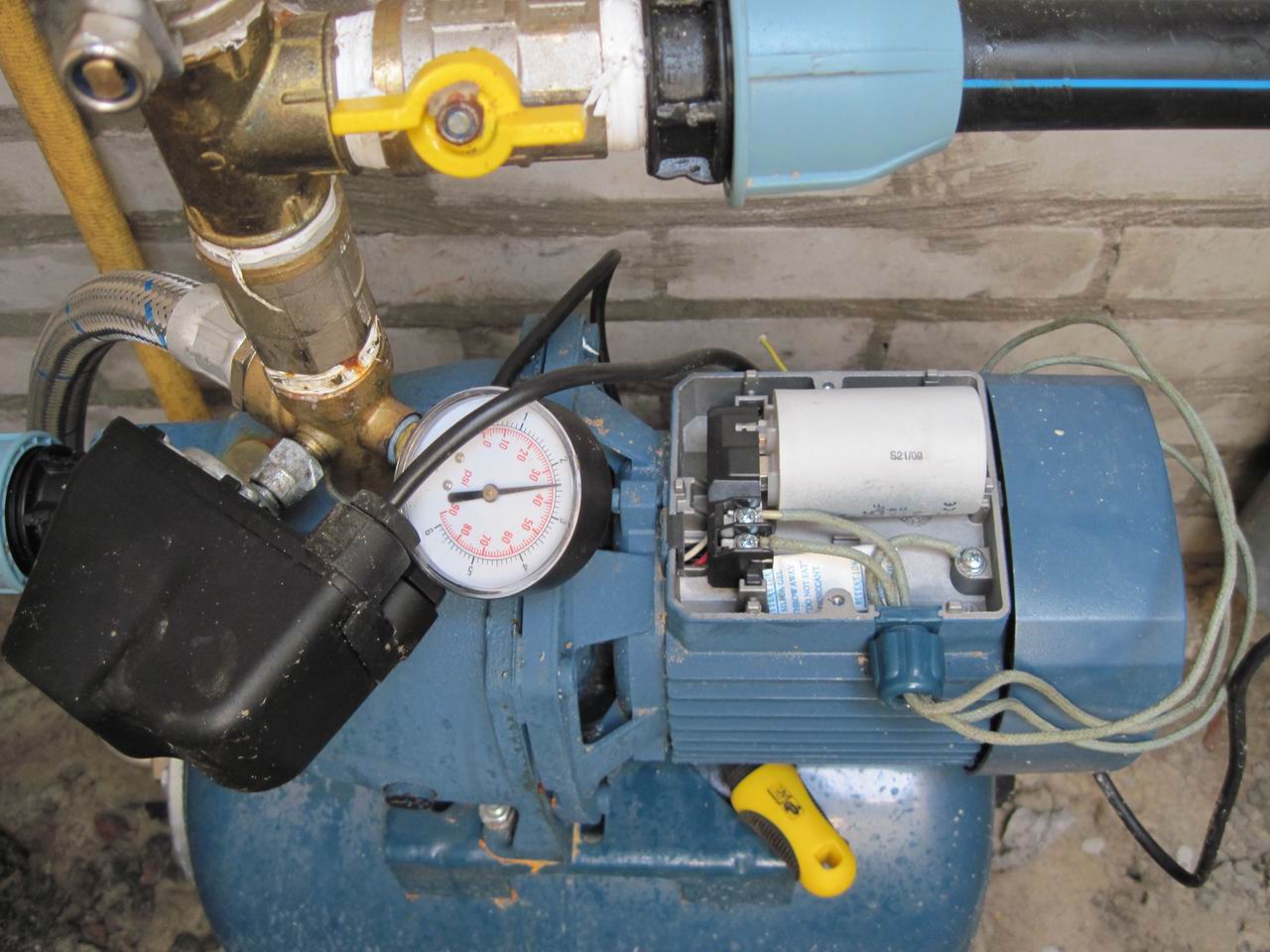 Nous courons vers la pompe et regardons avec impatience la pression monter. Nous avons un manomètre pour cela. Supposons qu'elle ait atteint 1,5 atmosphère et que la pompe se soit éteinte. Hourra ! Tout fonctionne. Il ne reste plus qu'à régler le relais sur la pression souhaitée. Mais avant cela, nous ouvrons l'eau dans les toilettes (nous crions à l'un de nos proches, ou appelons si la maison est grande) et regardons comment la pression commence à baisser. Supposons qu'il tombe à 1 atmosphère et que la pompe se mette en marche. Oui! Tout fonctionne vraiment.
