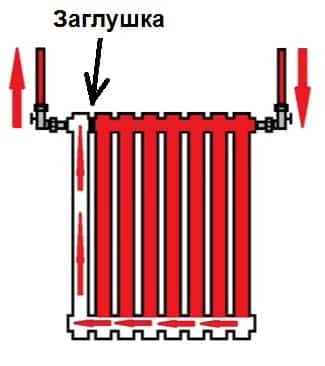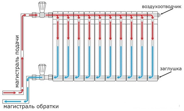 1. Diagonale. Le liquide de refroidissement entre par l'entrée supérieure et le retour est connecté du côté opposé à la sortie inférieure. Le type de connexion optimal qui fournit un chauffage uniforme de toute la zone de la batterie. De cette manière, connectez correctement la batterie de chauffage dont la longueur dépasse 1 mètre. La perte de chaleur ne dépasse pas 2%.