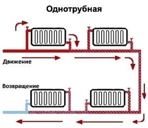 Cette option prévoit l'alimentation en liquide de refroidissement d'un appareil de chauffage, qui est généralement situé dans un bâtiment à plusieurs étages. Ces méthodes de connexion des batteries de chauffage sont les plus simples, car leur mise en œuvre ne nécessite aucune compétence sérieuse en construction (lire: «Système de chauffage à circuit unique - schémas de mise en œuvre possibles»). Le principal inconvénient de cette conception est le manque de contrôle sur l'apport de chaleur, car ce système ne fournit aucun dispositif spécial comme un capteur de température qui remplit cette fonction. C'est pourquoi le volume de transfert de chaleur est strictement fixé et est prescrit à l'avance au stade de la rédaction du futur système.