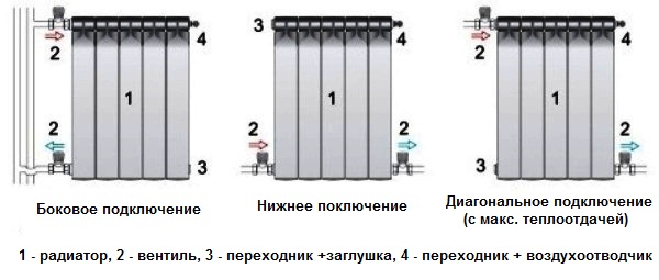 Vous pouvez connecter les radiateurs aux tuyaux de différentes manières, en fonction du lieu d'installation et de la pose des tuyaux dans la pièce et, bien sûr, du schéma de chauffage: