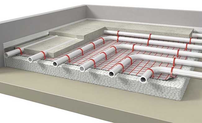 Plus l'épaisseur de l'isolation thermique est petite, plus l'épaisseur de l'ensemble du gâteau de couches diminue. En conséquence, la hauteur des flux dans la pièce est légèrement réduite. L'épaisseur de la chape sur un sol chauffé à l'eau peut varier entre 50 et 60 mm.