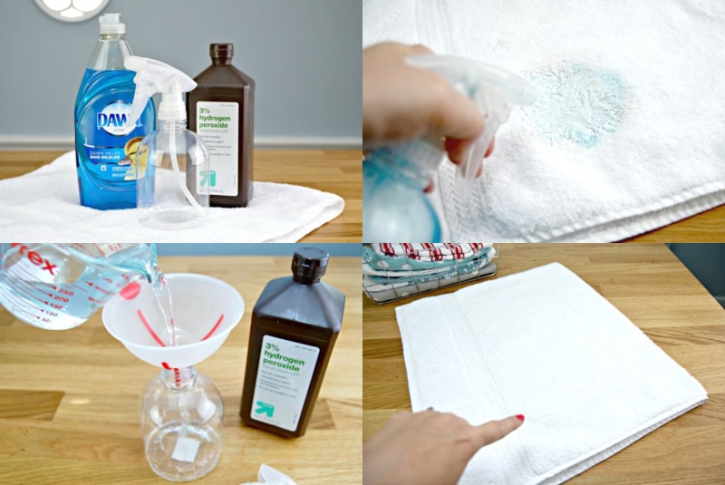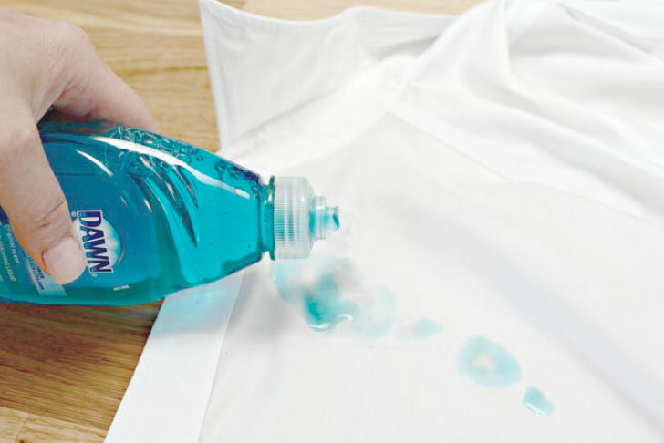 Cette composition frotte un endroit sale. Le produit est laissé à tremper, puis lavé. Le peroxyde d'hydrogène est un agent de blanchiment et le détergent à vaisselle est un dégraissant. Avec cet outil, les taches sales sur un T-shirt disparaîtront pour toujours.
